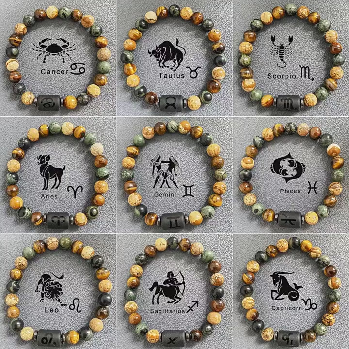 12 Zodiac Signs Bracelets Set for Men - Black Obsidian Lava Stone Elastic Beads Astrology Collection